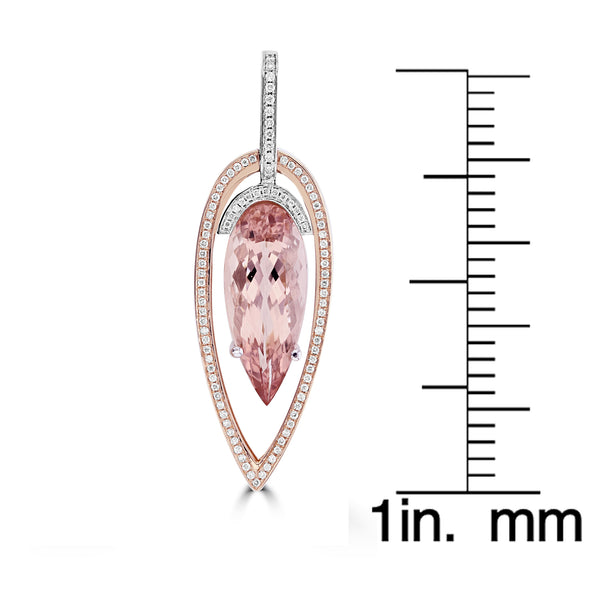 Garner attention where ever you go with this stunning pendant/necklace it showcases a stunning pear shape Morganite 12.85cts (1) and is adorned by 0.55cts of dazzling round brilliant cut diamonds. Hangs beautifully from a 16 inch white gold chain.