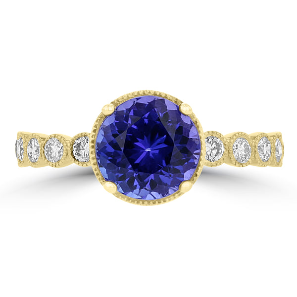 This unique ring showcases a bold violet-blue round cut Tanzanite 2.35cts TGW and is accented with 0.30cts (10) of round brilliant cut diamonds adorning each side of the band. It's crafted in 14-karat yellow gold and enhanced with a miligrain finish. Perfect gift for that someone in your life with a December birthday, as a promise ring or anniversary present. Made in the USA.