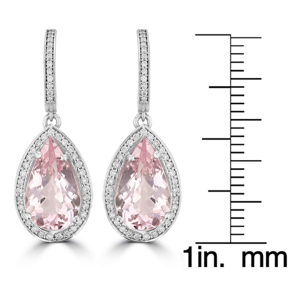 Crafted in 14K white gold this lovely pendant necklace showcase a pink pear shape morganite prong set and surronded by a single halo and bail accented by 0.60cts of round brilliant cut diamonds. It hangs beautifully from a 16 inch chain. It is set in a high polish finish for the perfect amount of luster.